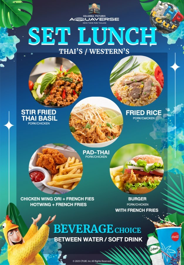 На территории имеются закусочные и кафе на любой вкус: бургеры, куриные наггетсы, пицца, картошка фри, блюда тайской кухни и вкуснейшее итальянское мороженое. Здесь никто не останется голодным! Так же для взрослых есть Тики-бар с изысканными коктейлями!