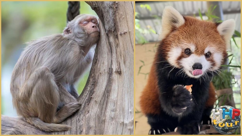 Малая панда справа и слева вид макак которые спят сидя.