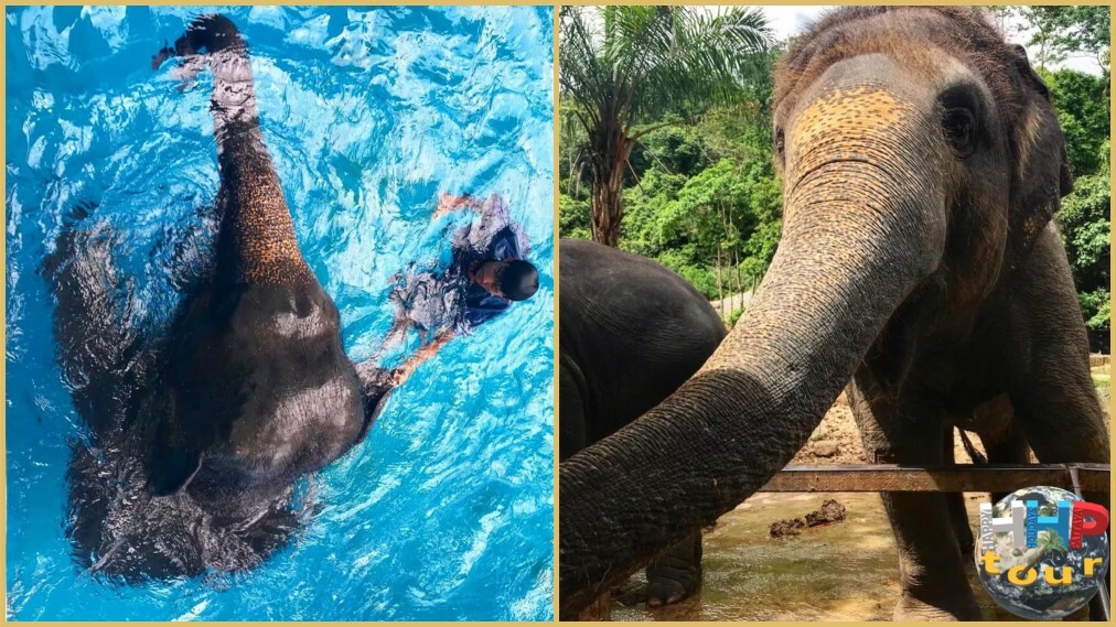 Кормление слона справа, шоу купание слона слева.