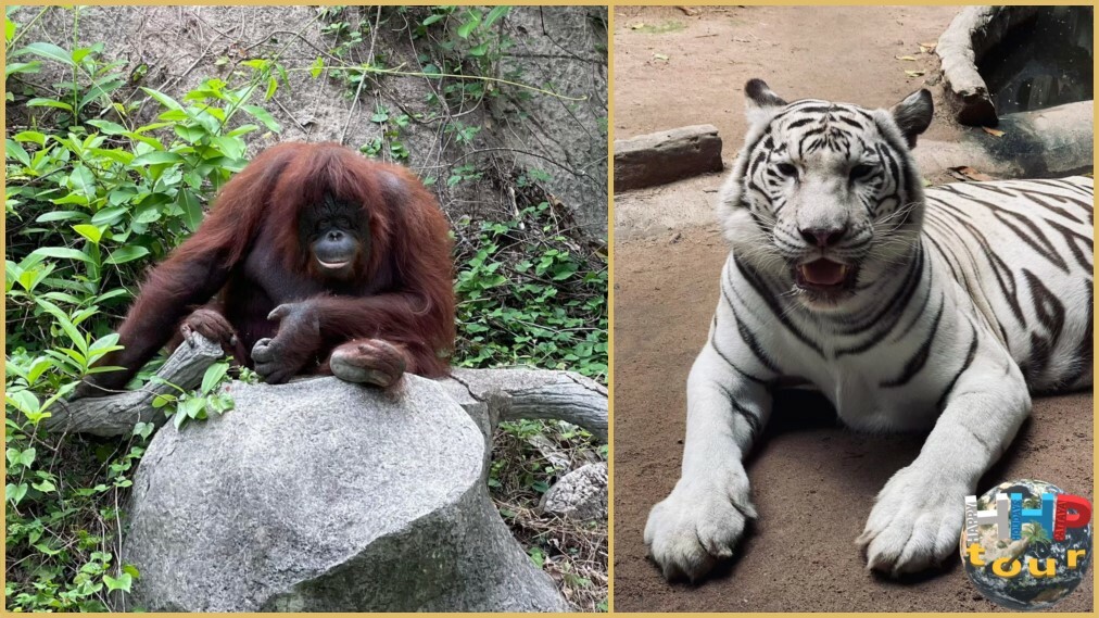 Белый бенгальский тигр справа и слева орангутан.